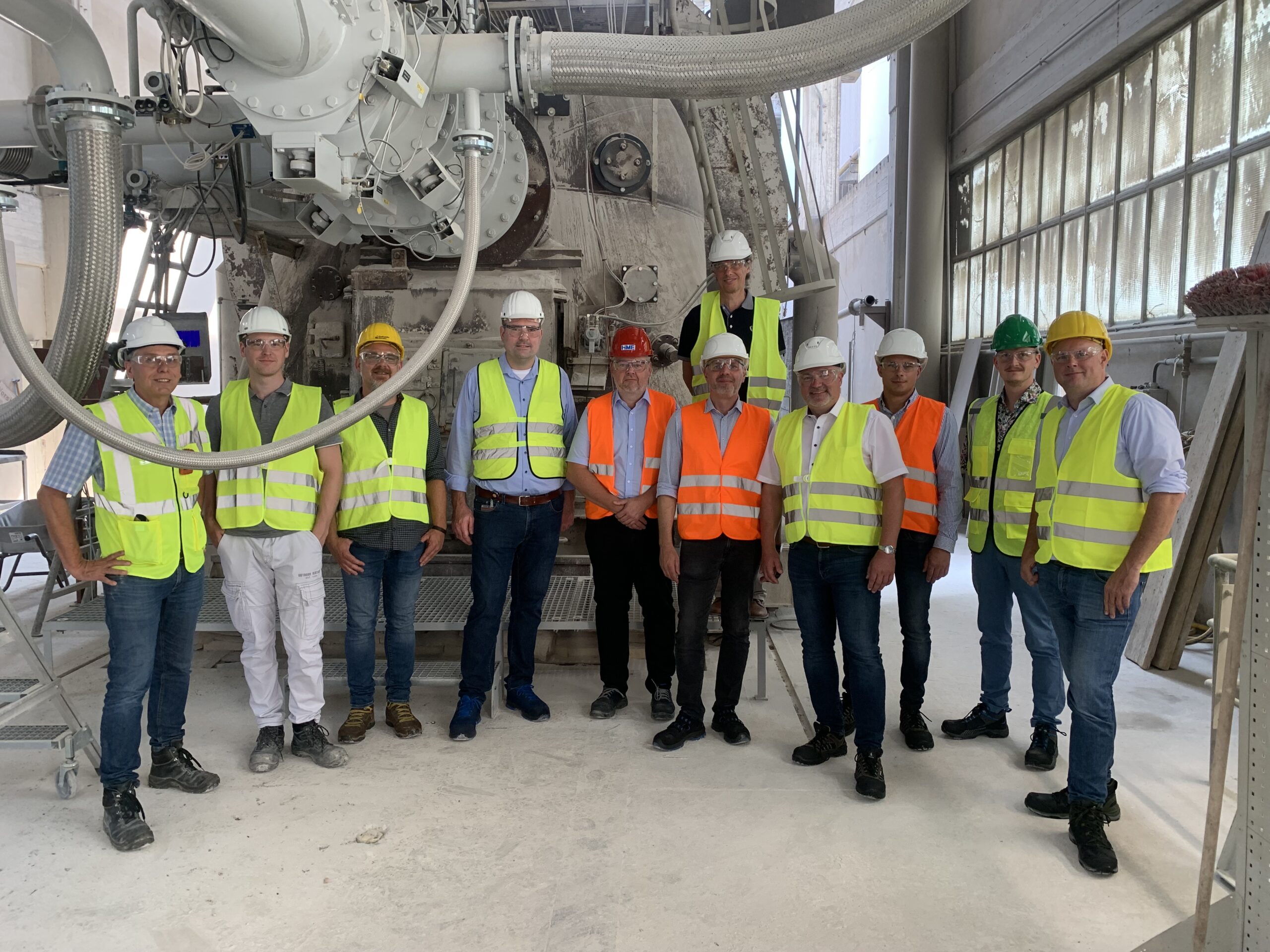 Caption: Stefan Flügge (left), Plant Manager at Lhoist-Kalkwerk Hönnetal, and Hubertus Borgmeier (4th from right), International Sales Manager at HJS, explain the joint project at the plant to the Menden efficiency network. (Image: Lhoist).